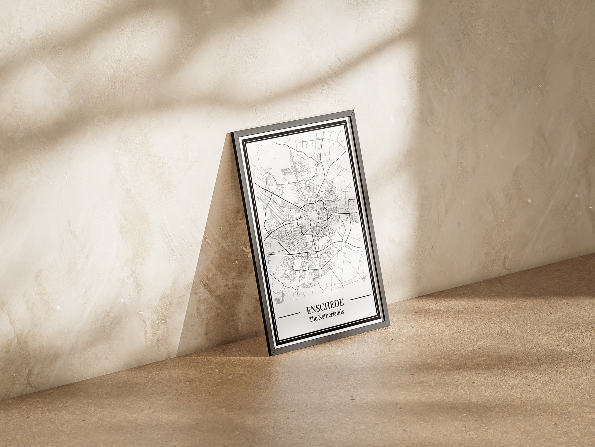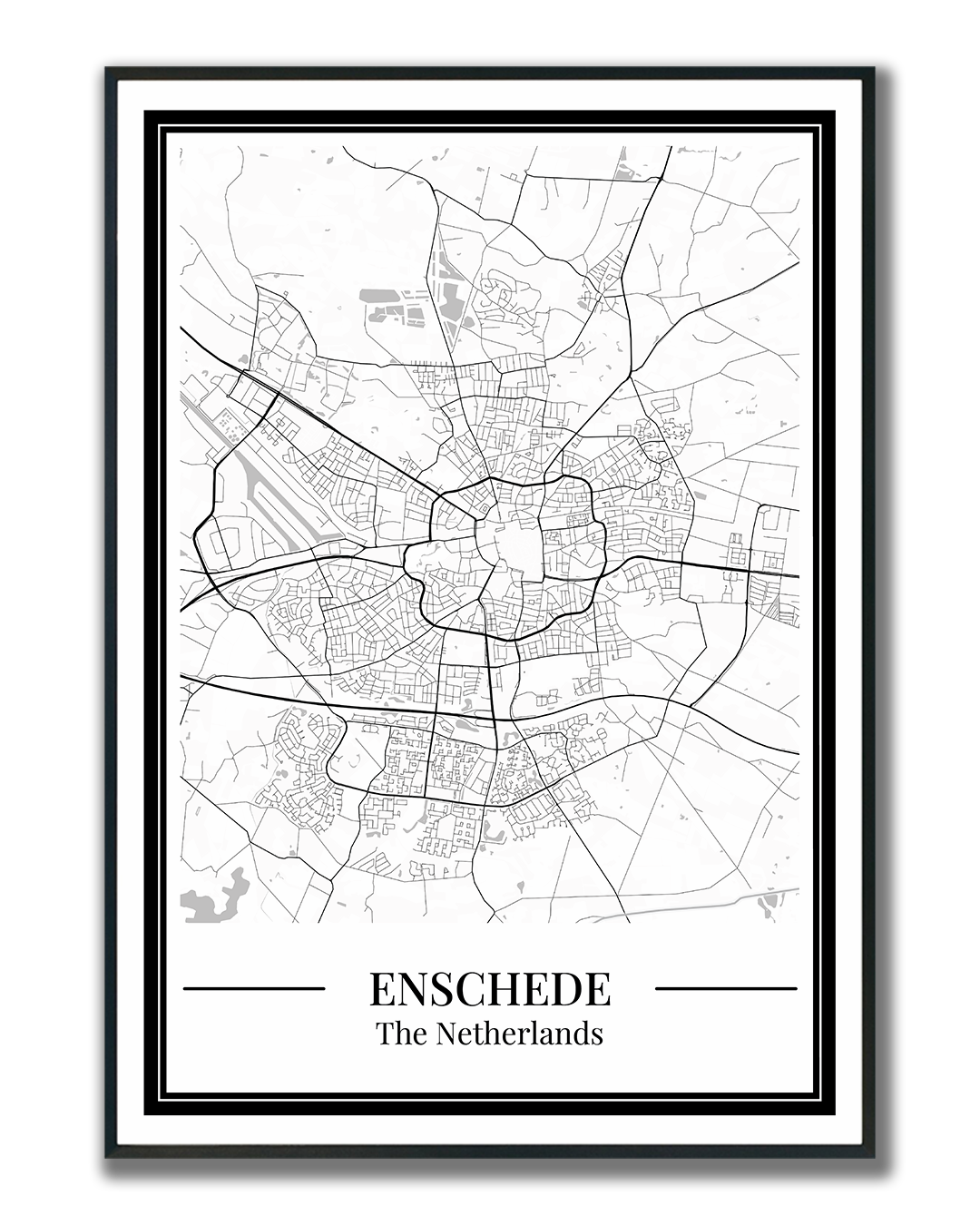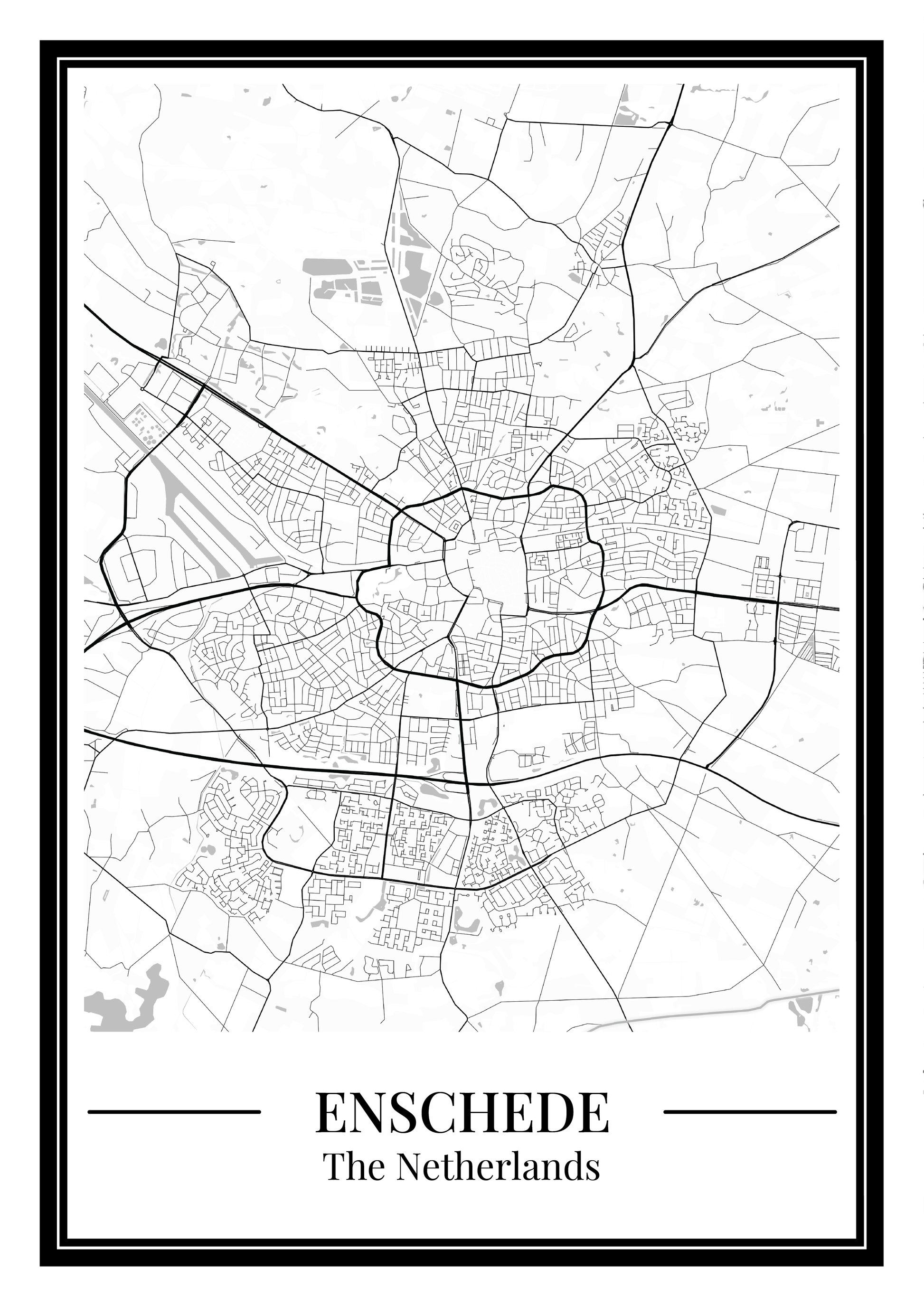 Enschede als wanddecoratie: deze stadskaart poster toont alle straten en wijken en brengt de stad stijlvol in huis. Perfect als cadeau of moderne toevoeging aan je interieur.