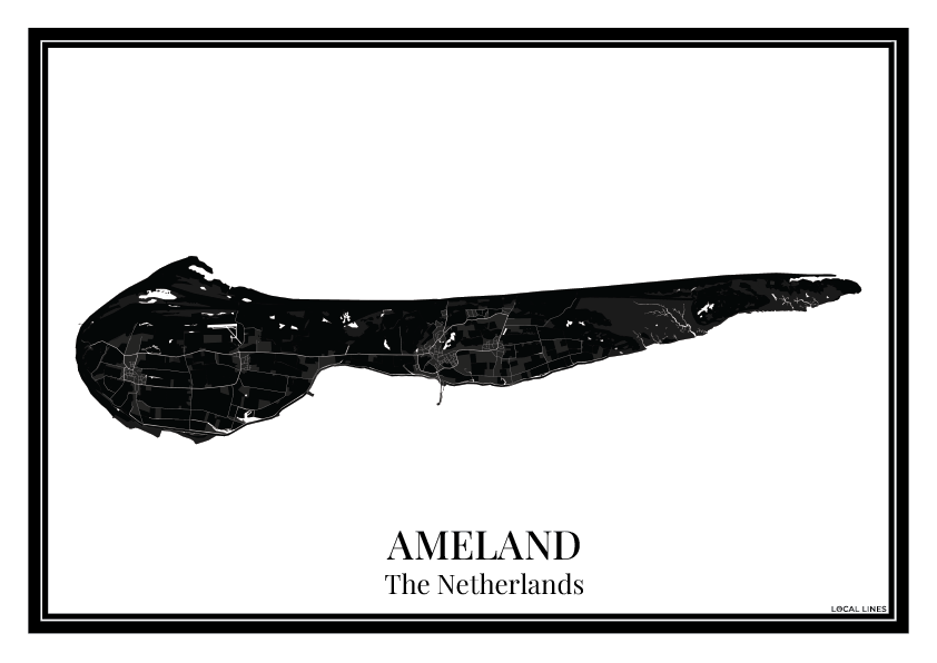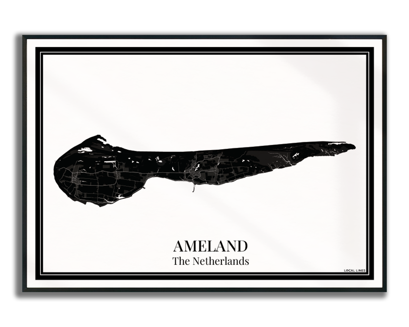 Ameland als wanddecoratie: deze eilandkaart poster toont alle straten en wijken en brengt het eiland stijlvol in huis. Perfect als cadeau of moderne toevoeging aan je interieur.