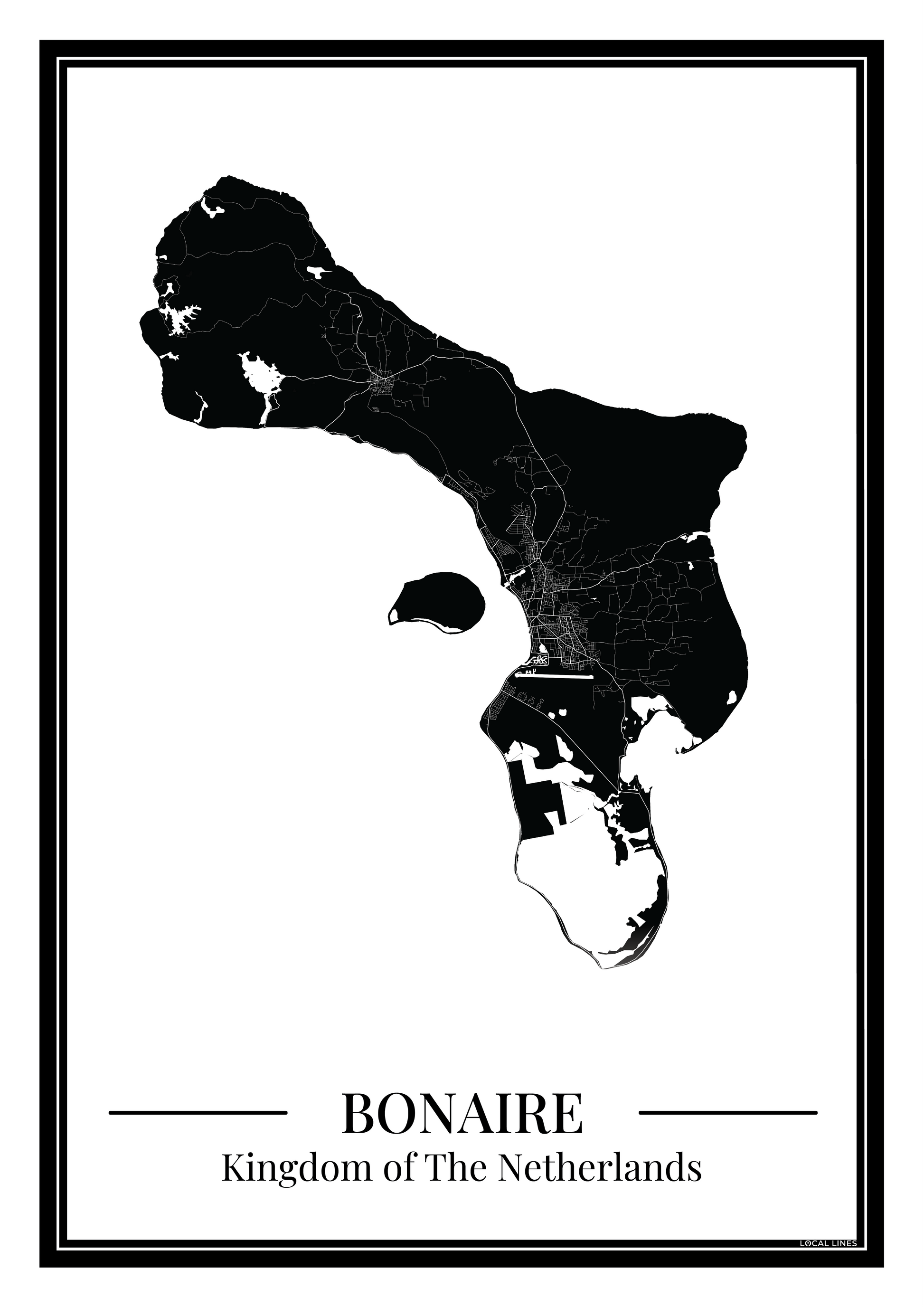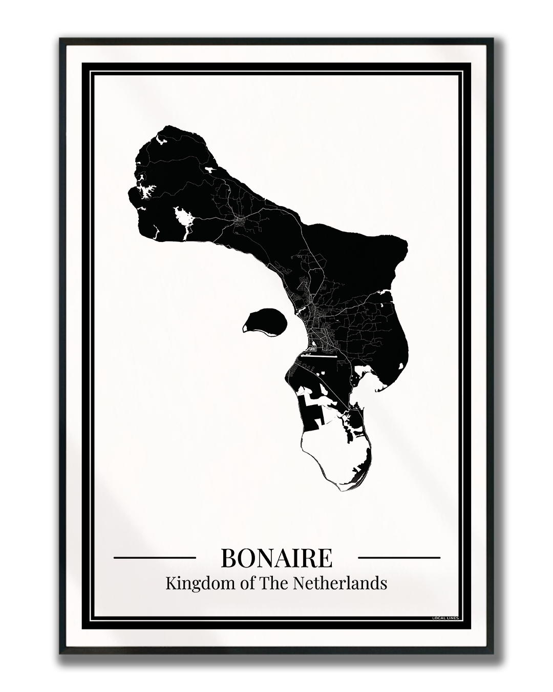 Geef je interieur een moderne en persoonlijke touch met deze Bonaire poster. De zwarte eilandkaart toont alle straten en plaatsen en is ideaal als wanddecoratie of origineel cadeau.