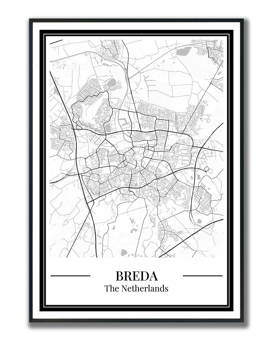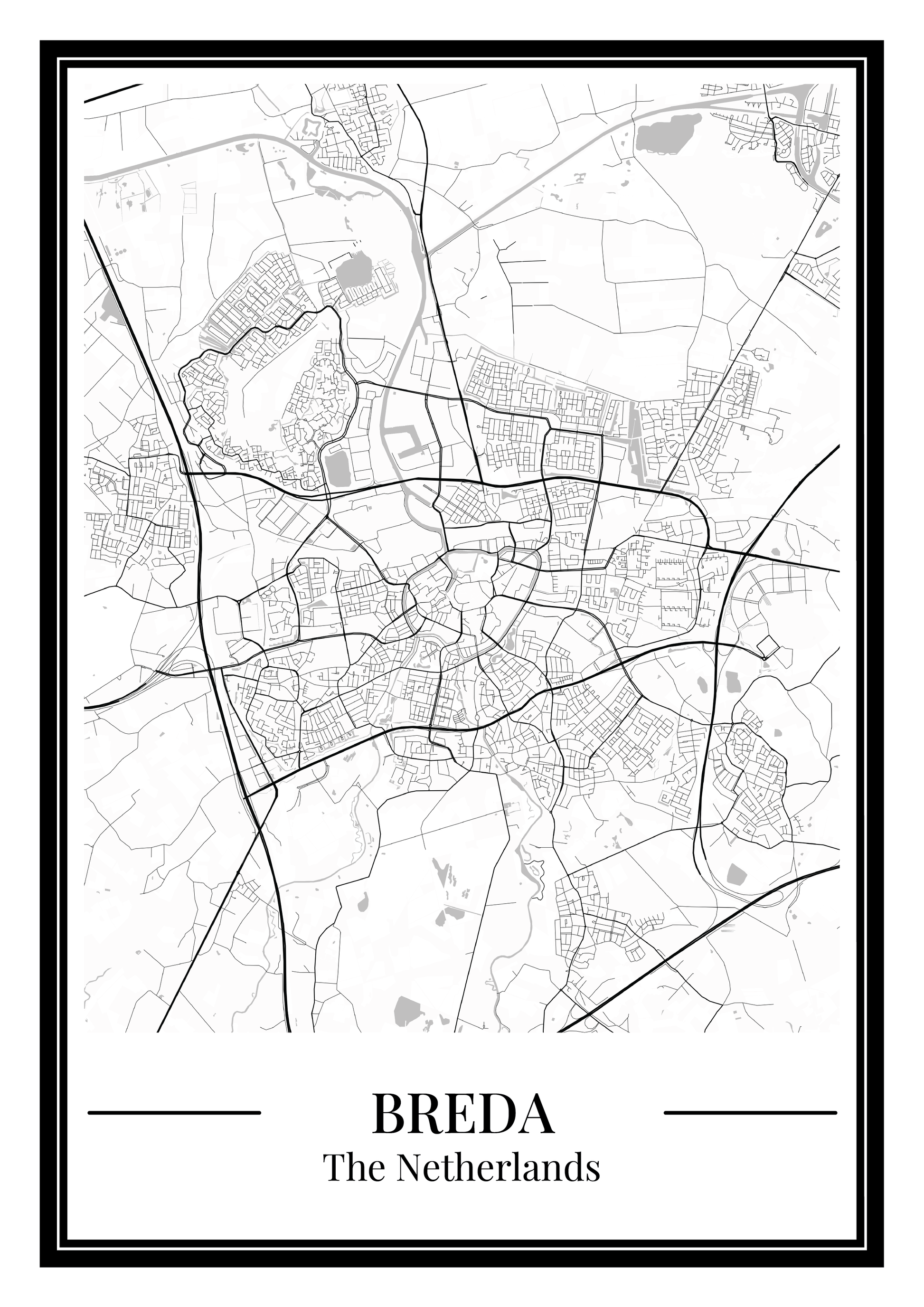 Breda als wanddecoratie: deze stadskaart poster toont alle straten en wijken en brengt de stad stijlvol in huis. Perfect als cadeau of moderne toevoeging aan je interieur.