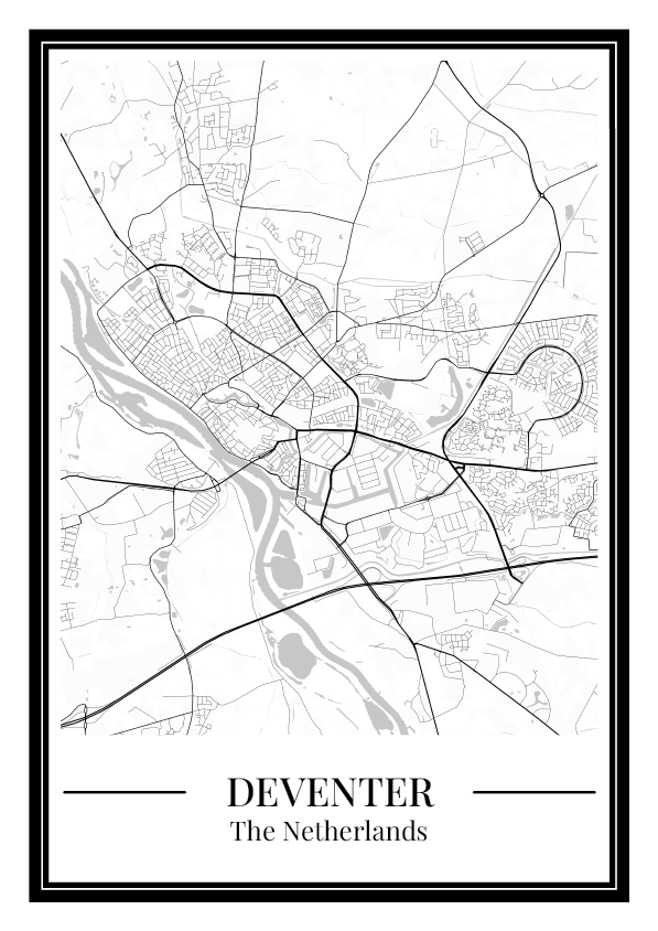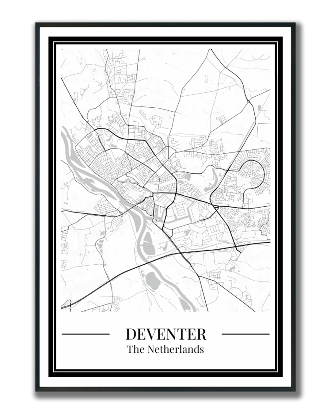 Deventer als wanddecoratie: deze stadskaart poster toont alle straten en wijken en brengt de stad stijlvol in huis. Perfect als cadeau of moderne toevoeging aan je interieur.