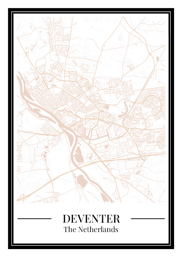 Geef je interieur een warme en stijlvolle uitstraling met deze Deventer stadskaart poster in beige. De gedetailleerde kaart laat de straten en wijken van Deventer duidelijk zien en maakt dit ontwerp een tijdloze toevoeging aan je wanddecoratie of een bijzonder cadeau voor elke gelegenheid.
