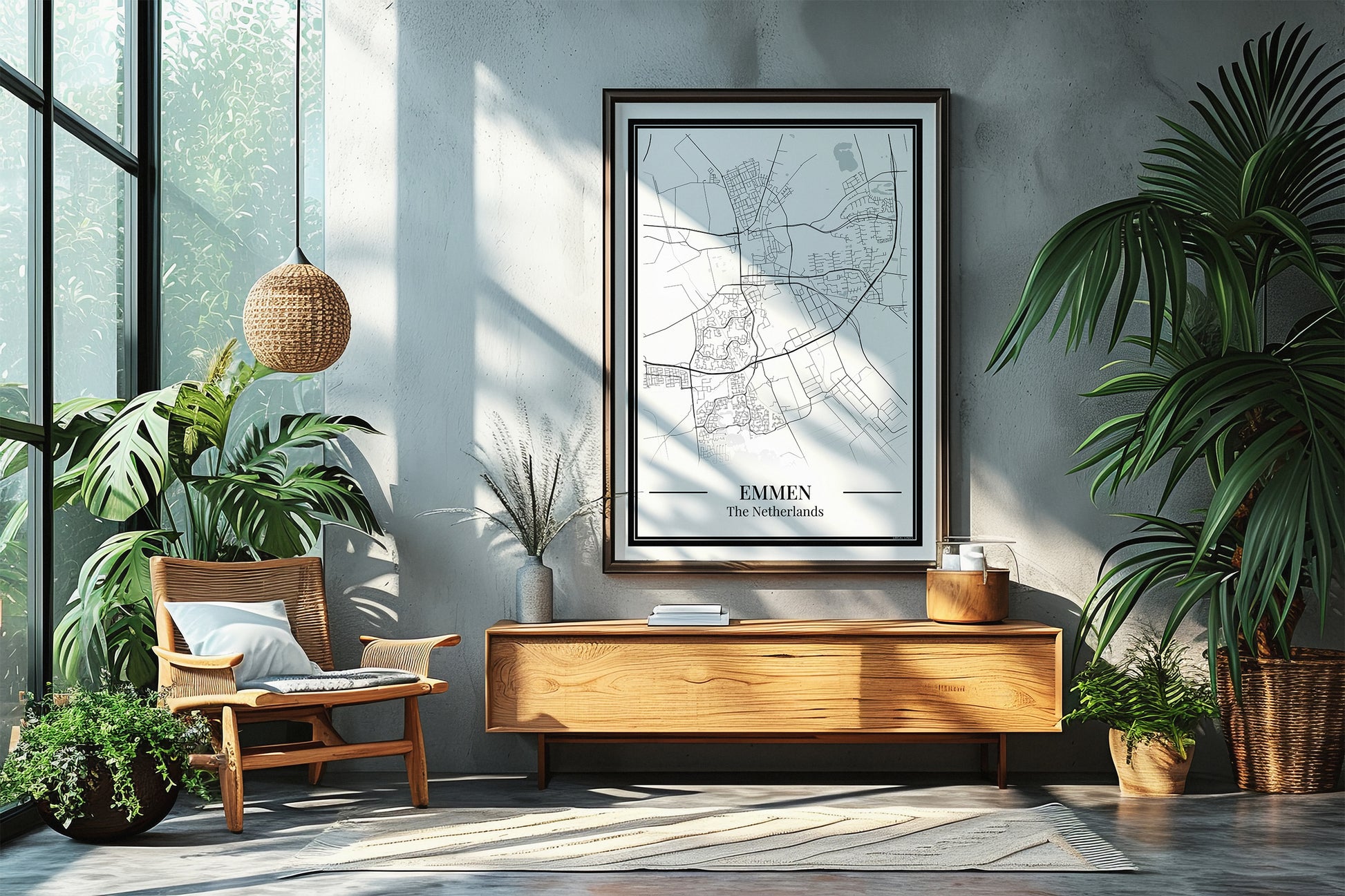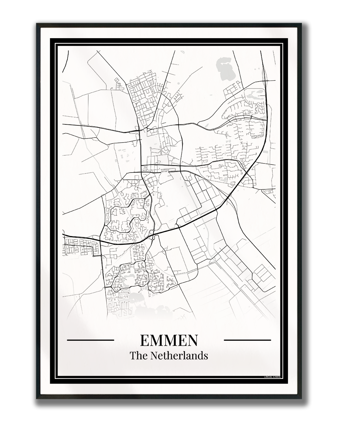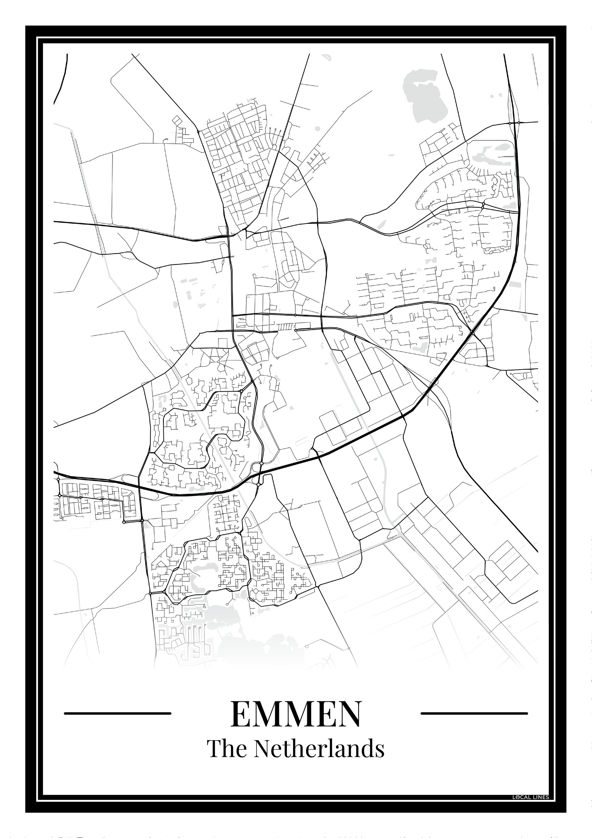 Geef je interieur een moderne en persoonlijke touch met deze Emmen poster. De stadskaart toont alle straten en wijken en is ideaal als wanddecoratie of origineel cadeau.