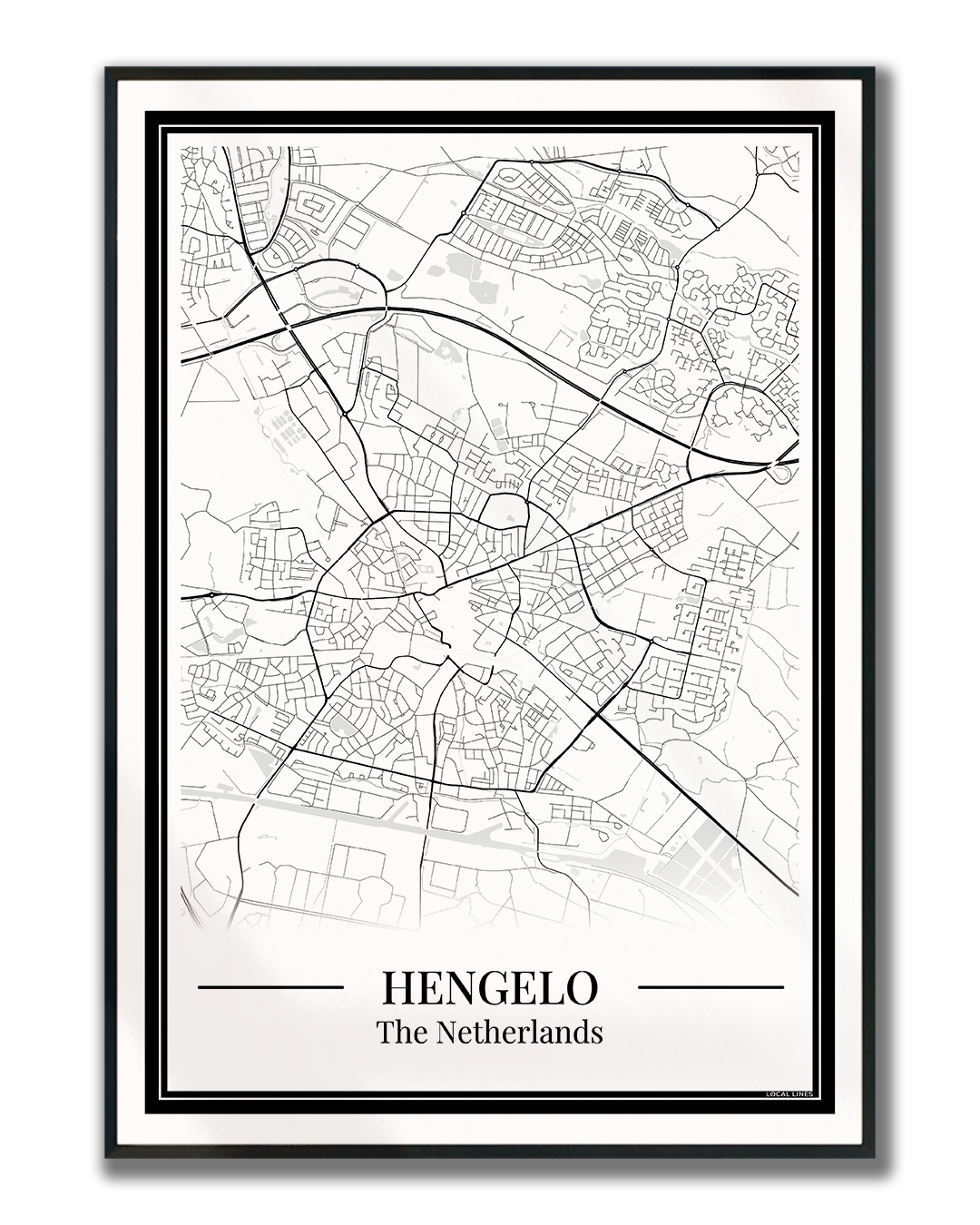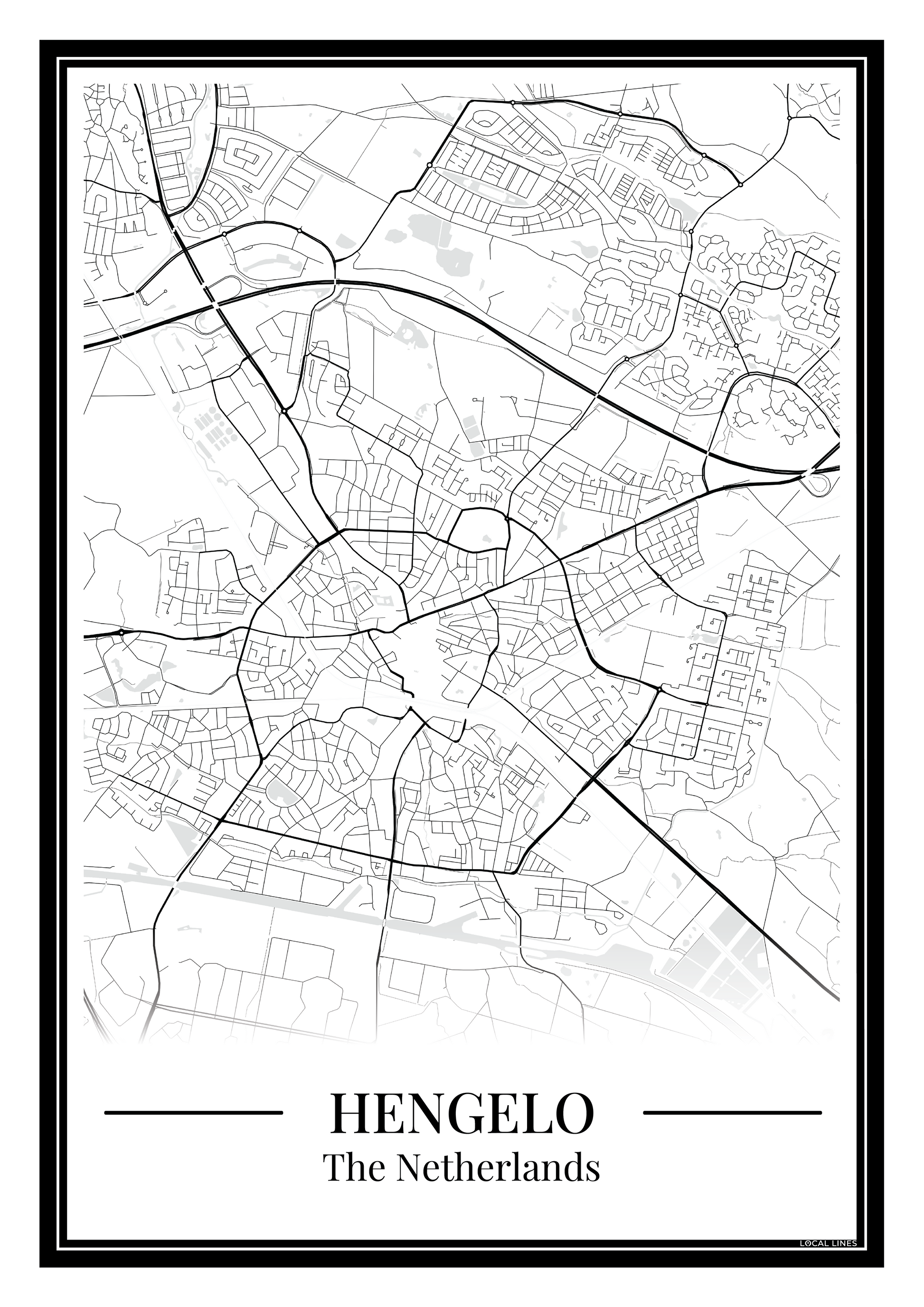 Geef je interieur een moderne en persoonlijke touch met deze Hengelo poster. De stadskaart toont alle straten en wijken en is ideaal als wanddecoratie of origineel cadeau.