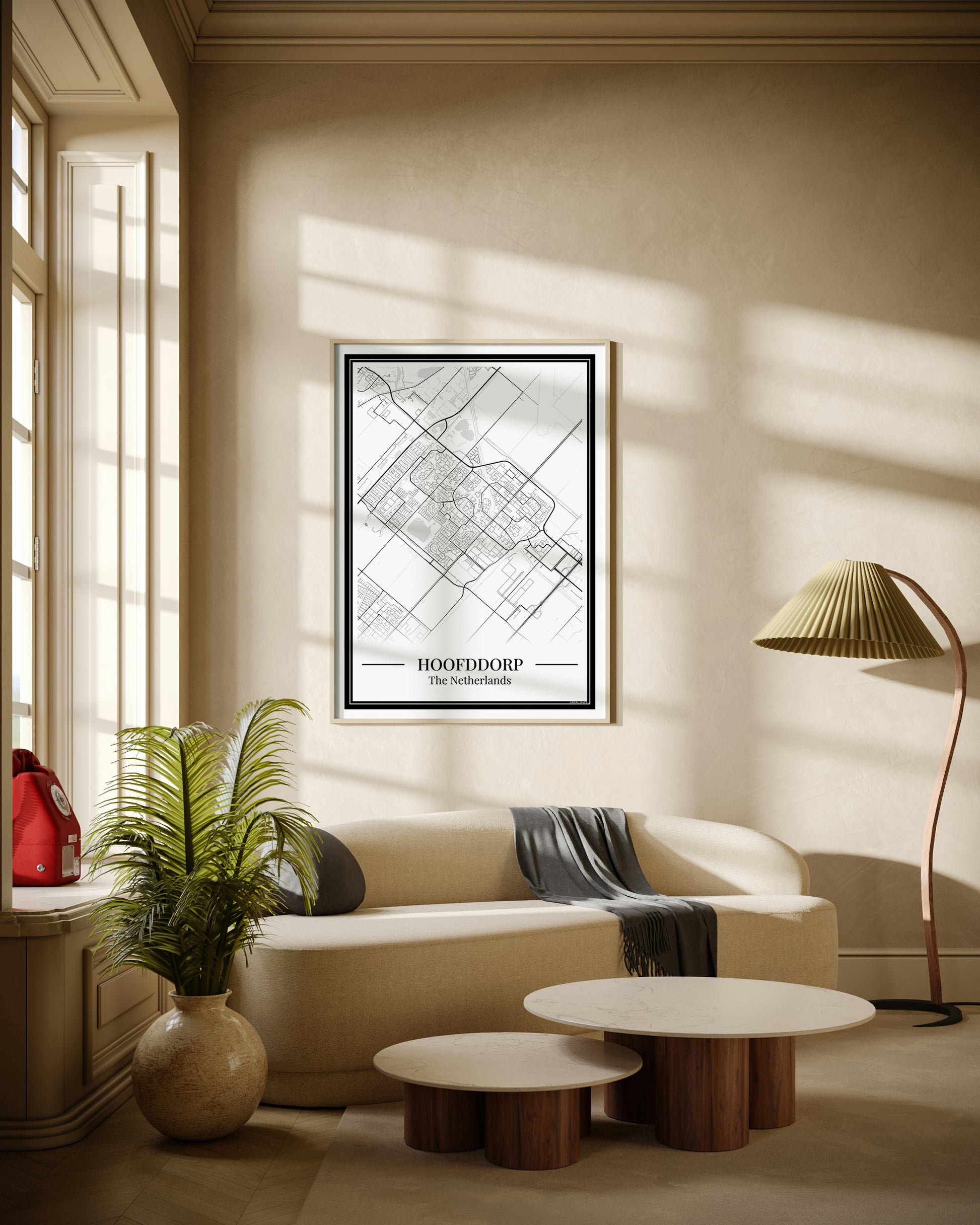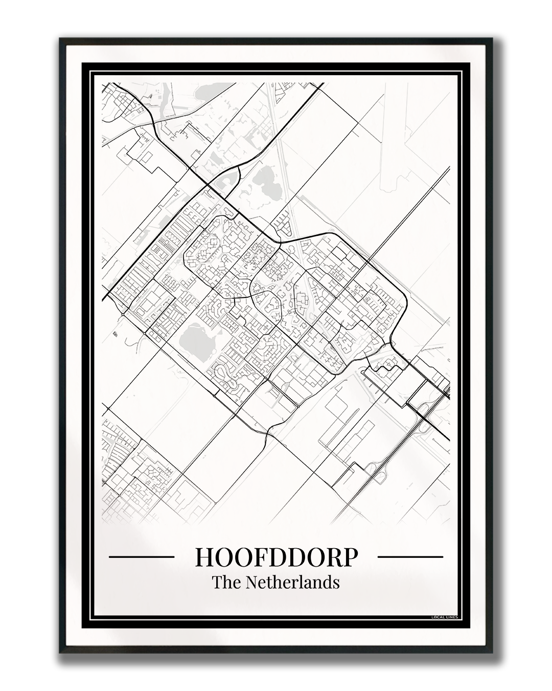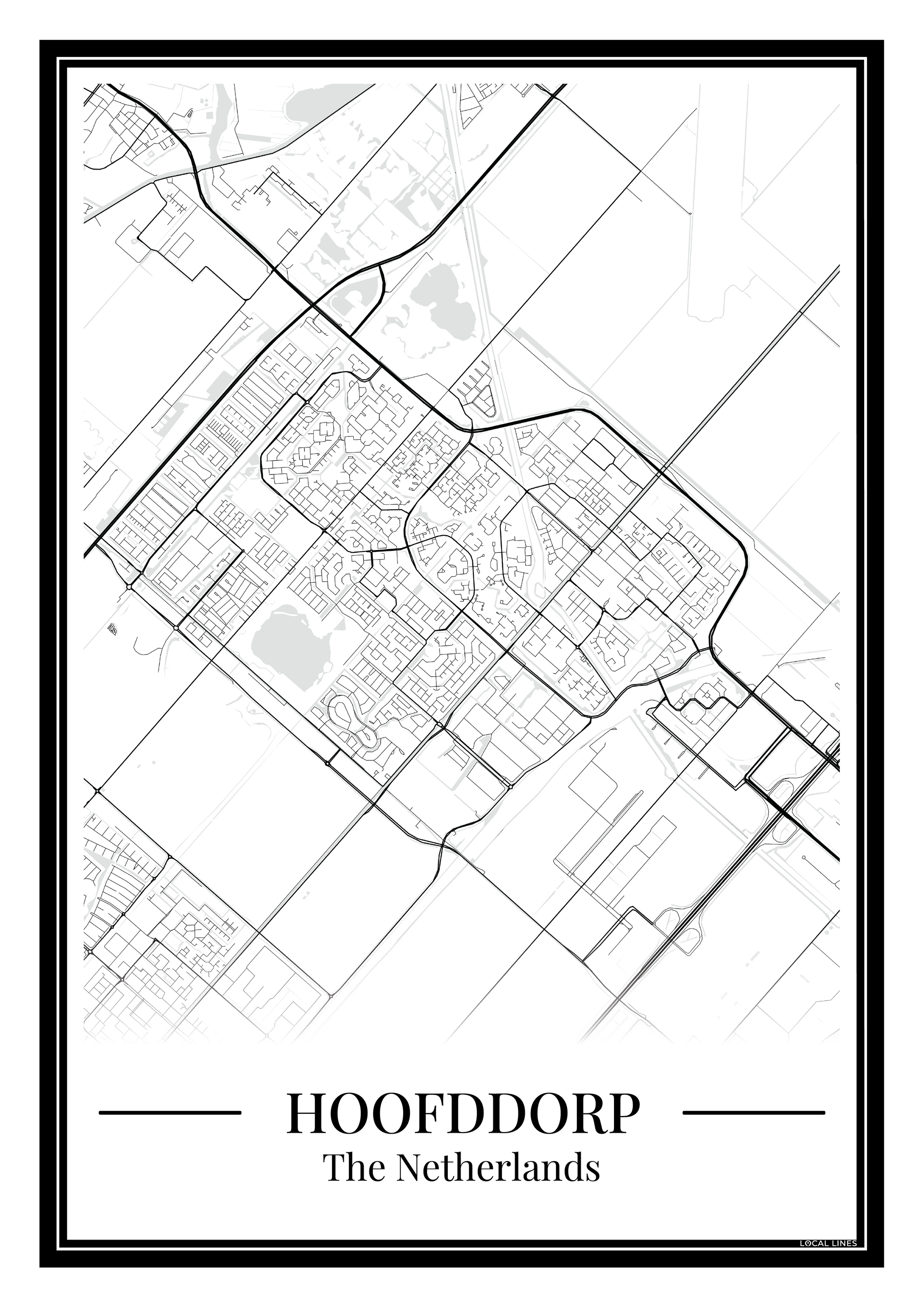 Geef je interieur een moderne en persoonlijke touch met deze Hoofddorp poster. De stadskaart toont alle straten en wijken en is ideaal als wanddecoratie of origineel cadeau.