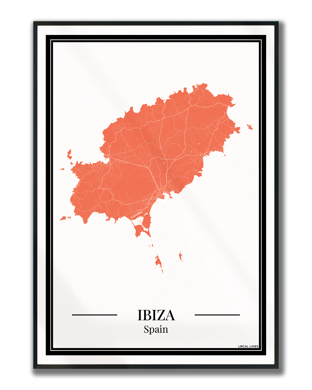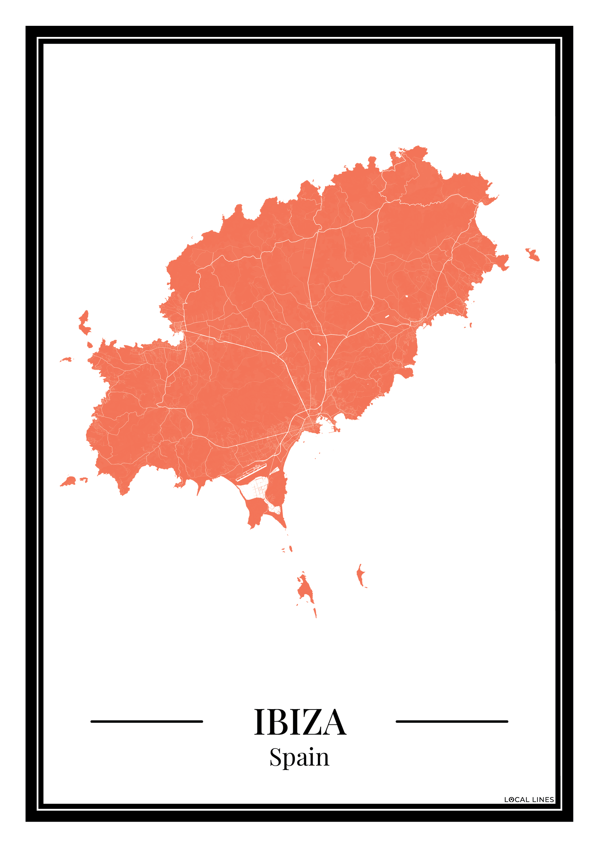 Geef je interieur een warme en stijlvolle uitstraling met deze Ibiza eilandkaart poster in oranje. De gedetailleerde kaart laat de straten en plaatsen van Ibiza duidelijk zien en maakt dit ontwerp een tijdloze toevoeging aan je wanddecoratie of een bijzonder cadeau voor elke gelegenheid.