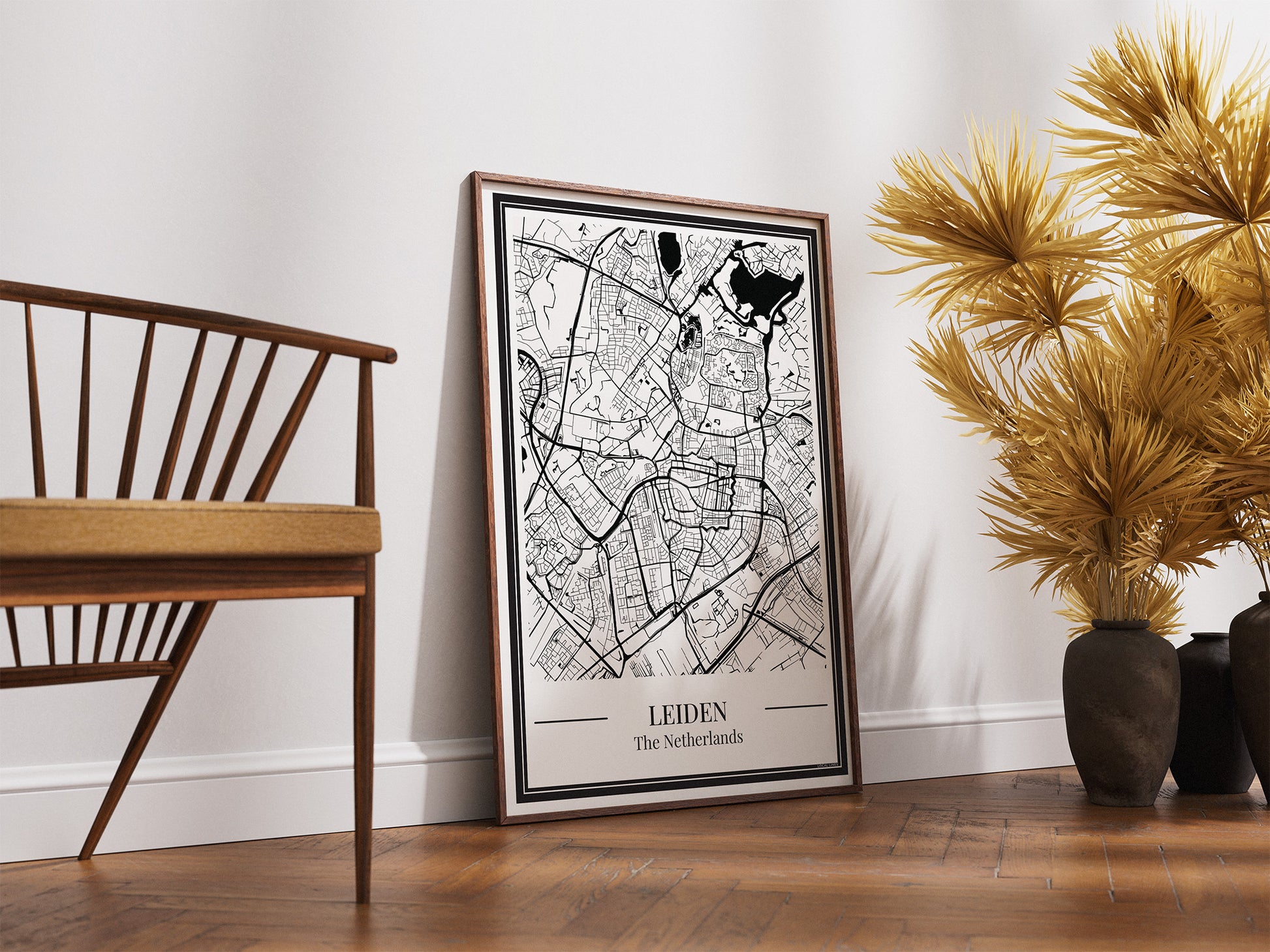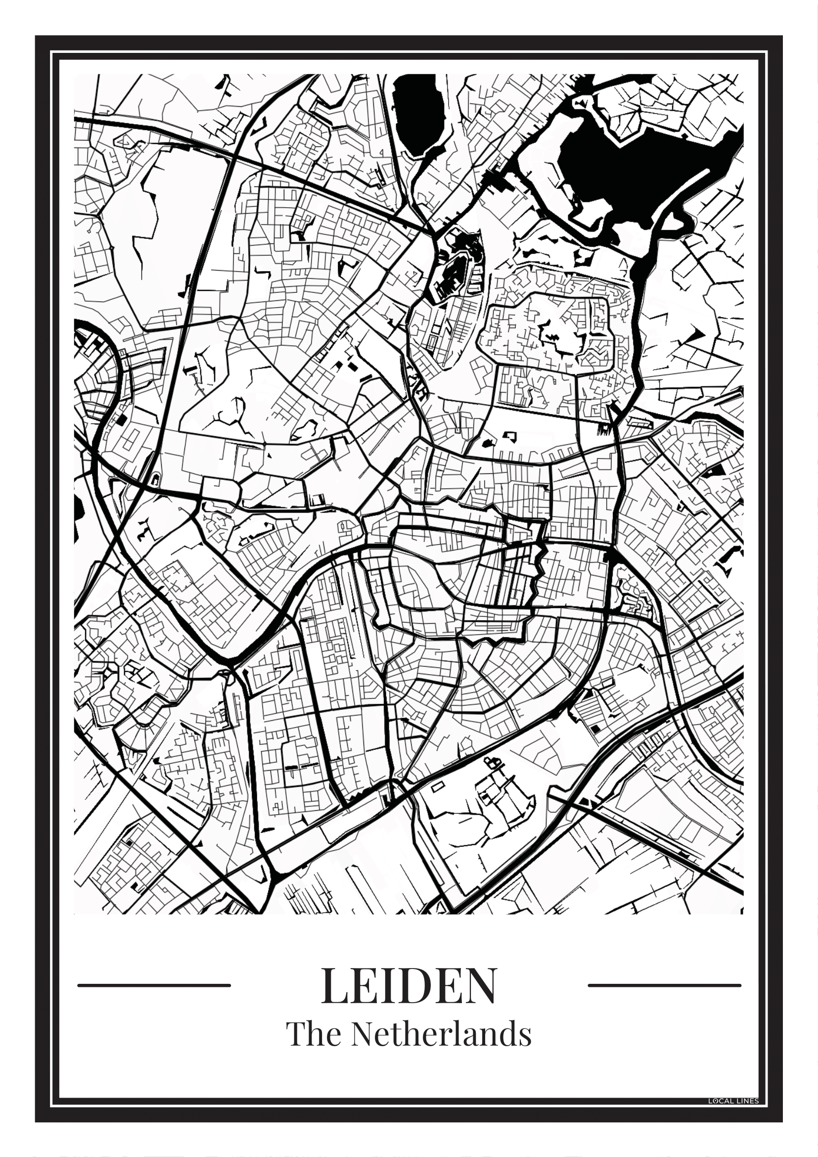 Leiden als wanddecoratie: deze stadskaart poster toont alle straten en wijken en brengt de stad stijlvol in huis. Perfect als cadeau of moderne toevoeging aan je interieur.