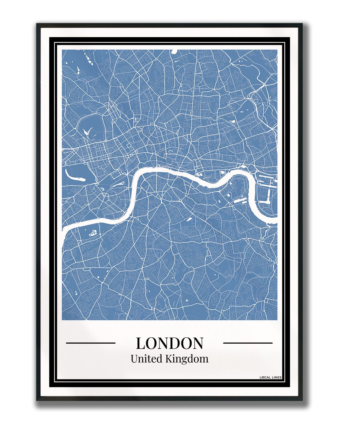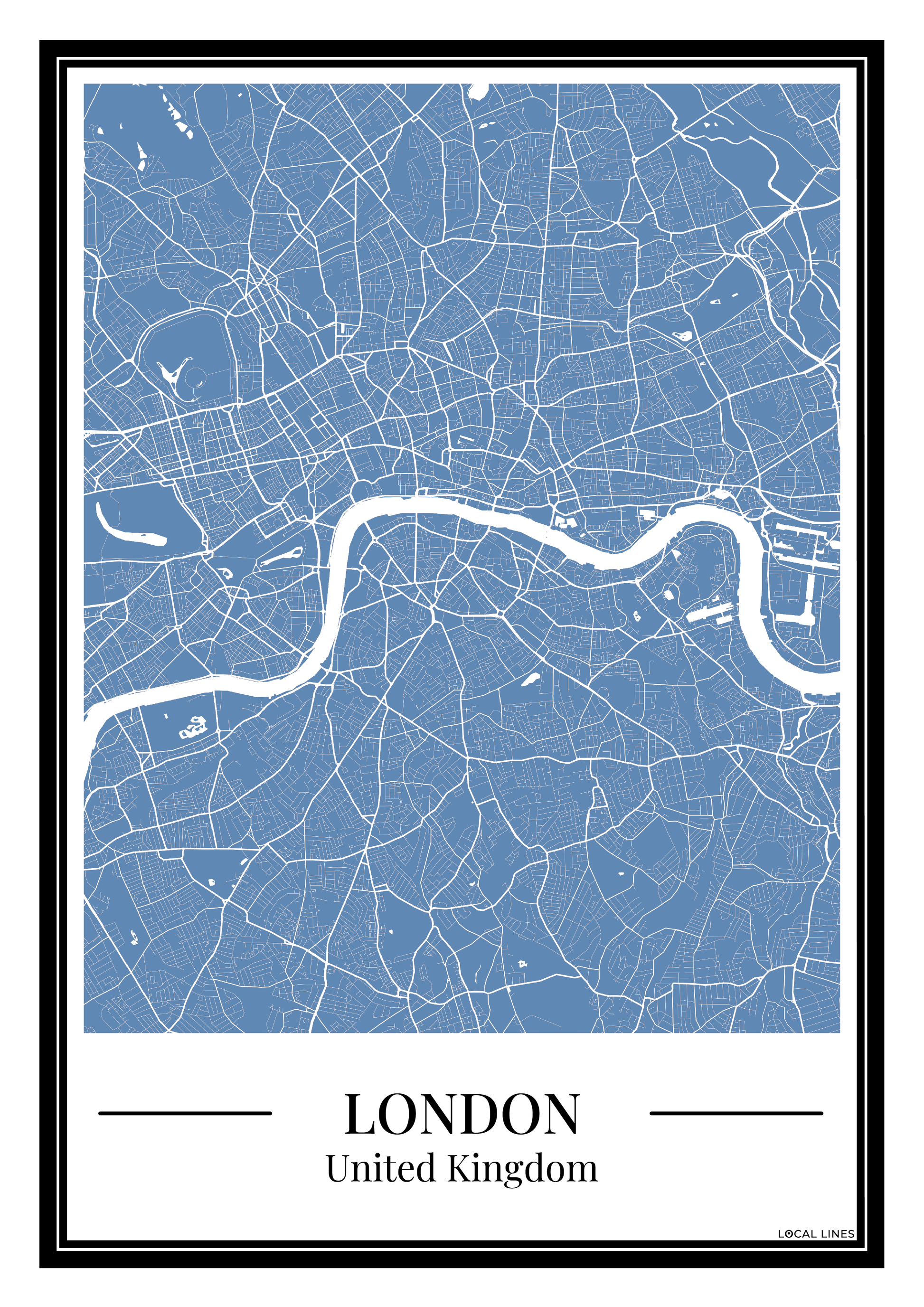 Ontdek de stad op een unieke manier met deze London stadsaart poster in blauw. De gedetailleerde plattegrond van London laat de straten en wijken duidelijk zien en maakt deze print een echte blikvanger voor aan de muur.
