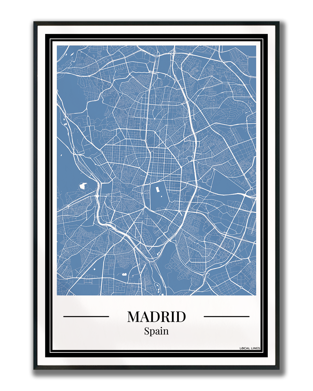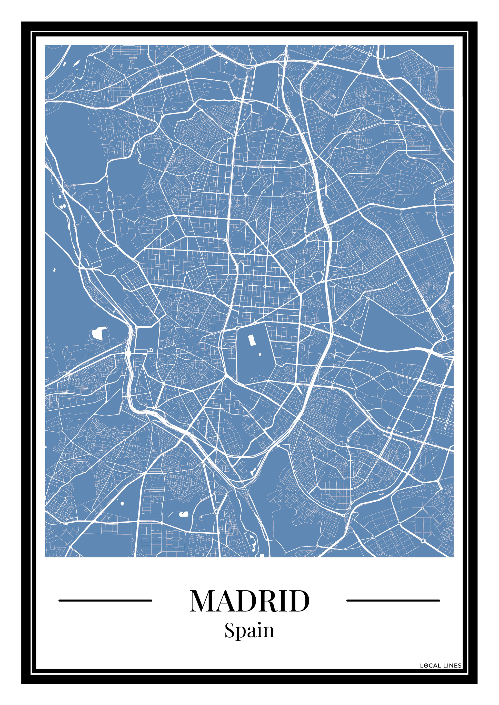 Ontdek de stad op een unieke manier met deze Madrid stadskaart poster in blauw. De gedetailleerde plattegrond van Madrid laat de straten en wijken duidelijk zien en maakt deze print een echte blikvanger voor aan de muur.