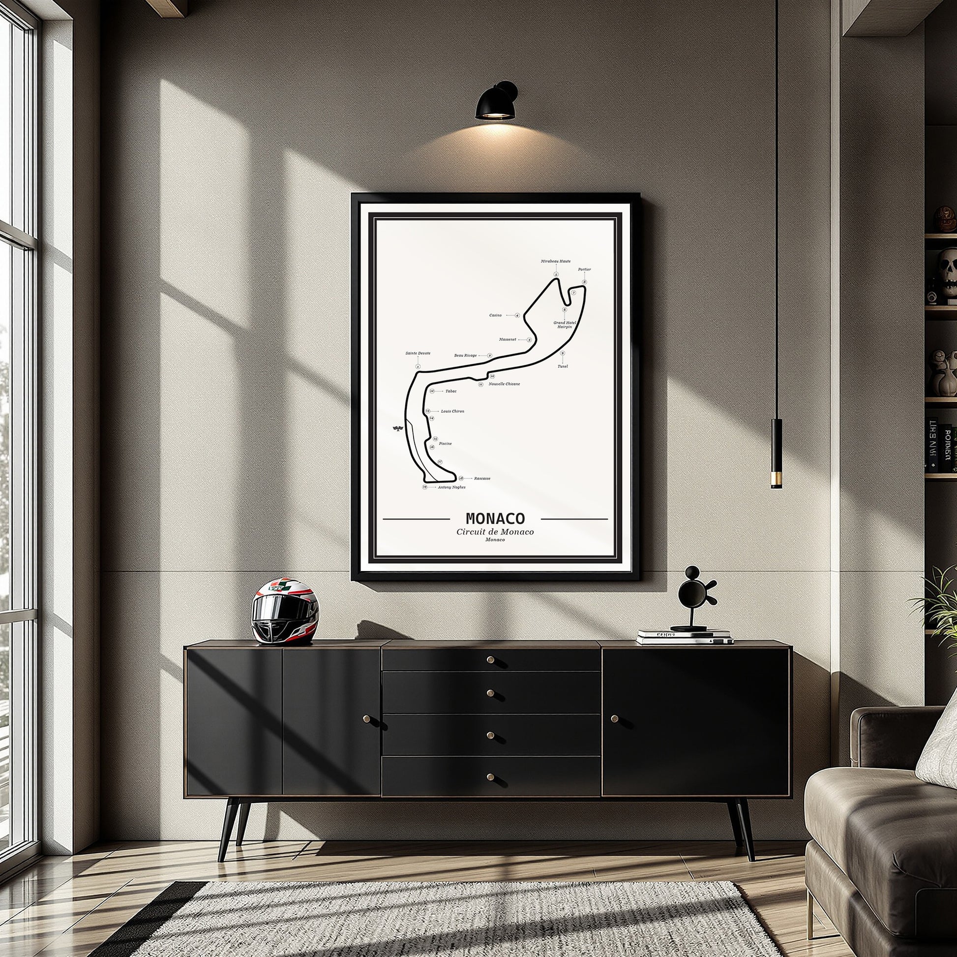 Voeg een vleugje glamour toe aan je interieur met deze Monaco circuit poster. Het iconische stratencircuit van Monte Carlo in minimalistisch wit ontwerp – perfect als stijlvolle wanddecoratie of cadeau voor Formule 1-liefhebbers.