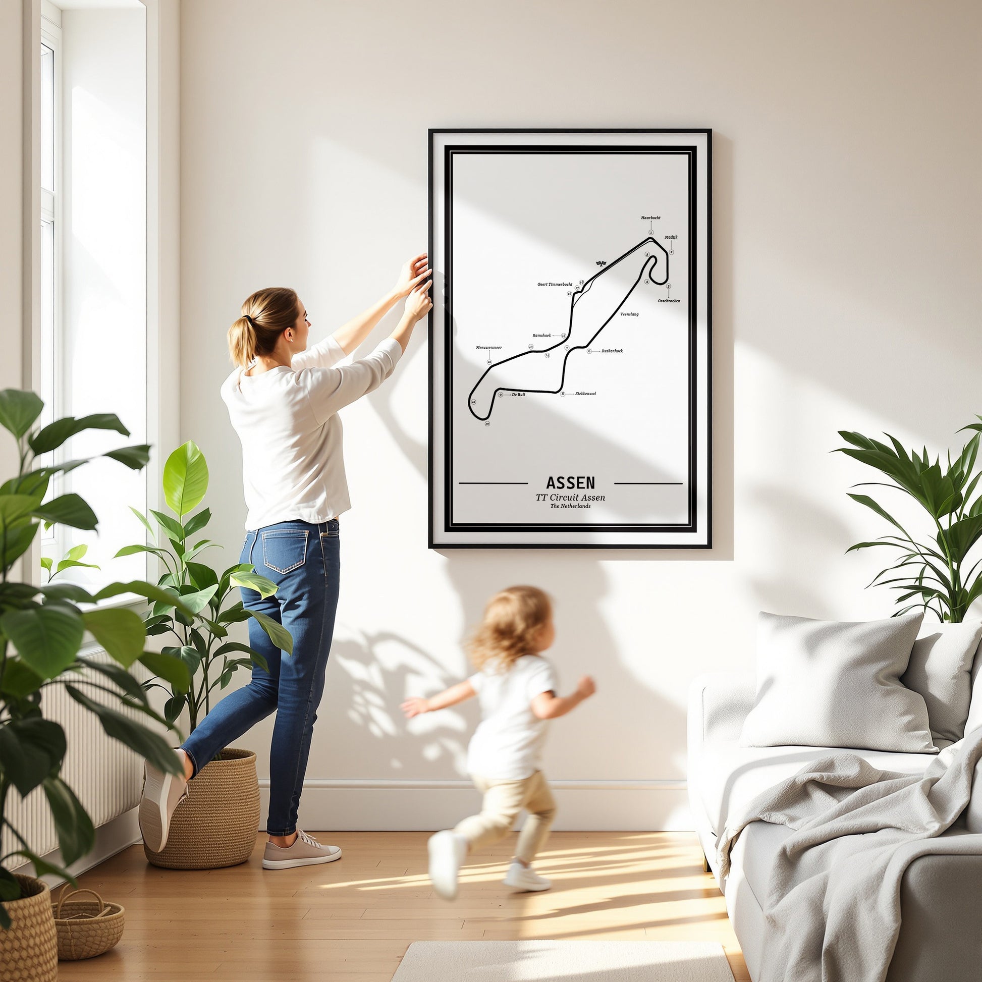 Breng het hart van de Nederlandse motorsport in huis met deze TT Assen circuit poster. Het beroemde Drentse circuit in een minimalistisch wit ontwerp – ideaal als decoratie of cadeau voor raceliefhebbers.