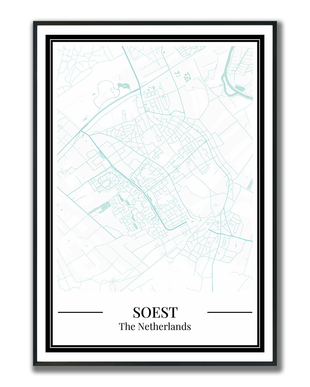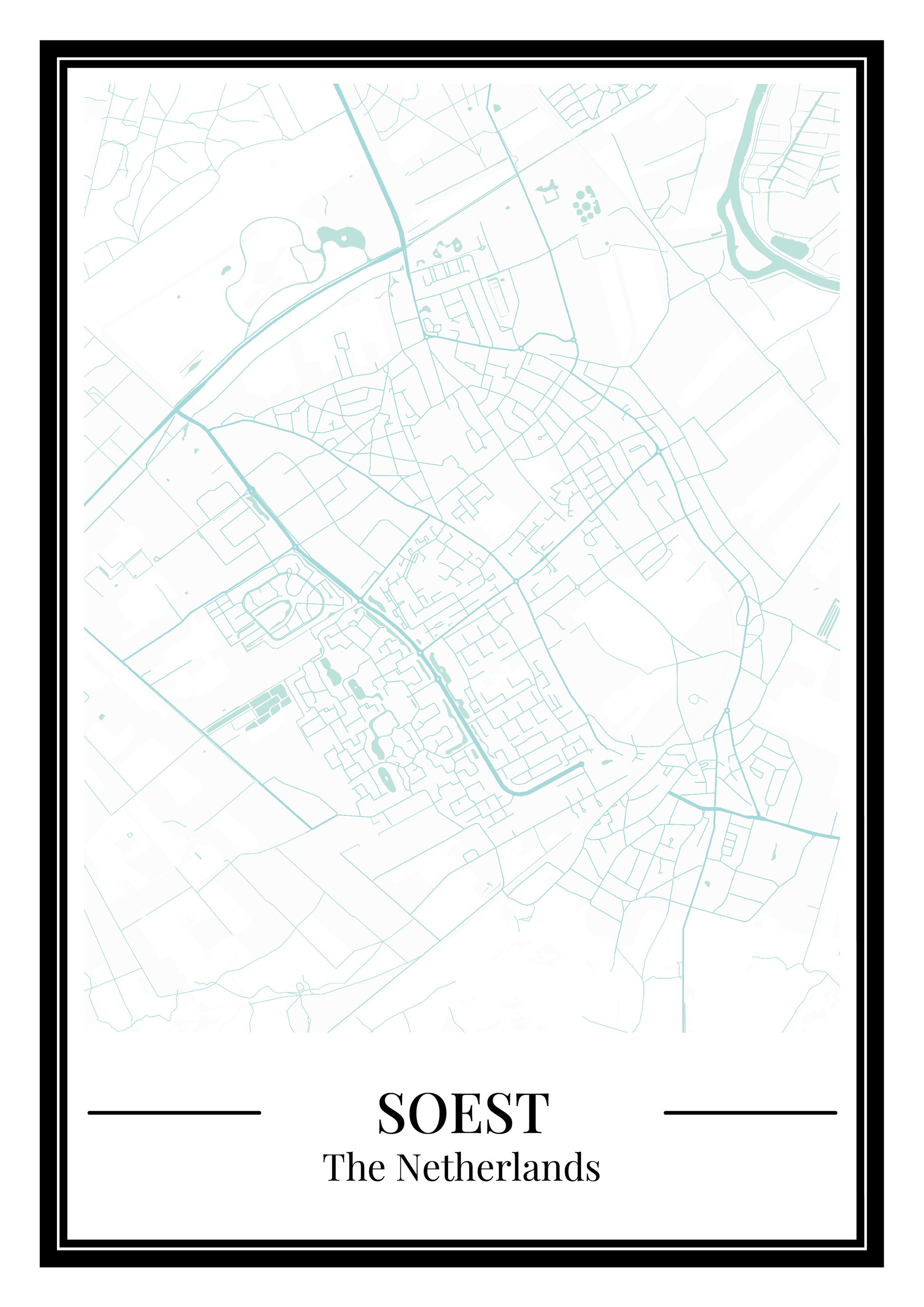Breng een frisse en moderne sfeer in huis met deze poster van de Soest dorpskaart in lichtblauw. De gedetailleerde plattegrond toont de straten van Soest op een stijlvolle manier, waardoor deze print een echte blikvanger is aan je muur. Perfect als persoonlijke wanddecoratie of als bijzonder cadeau voor een liefhebber.
