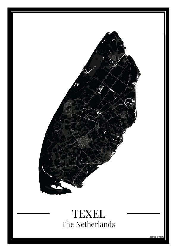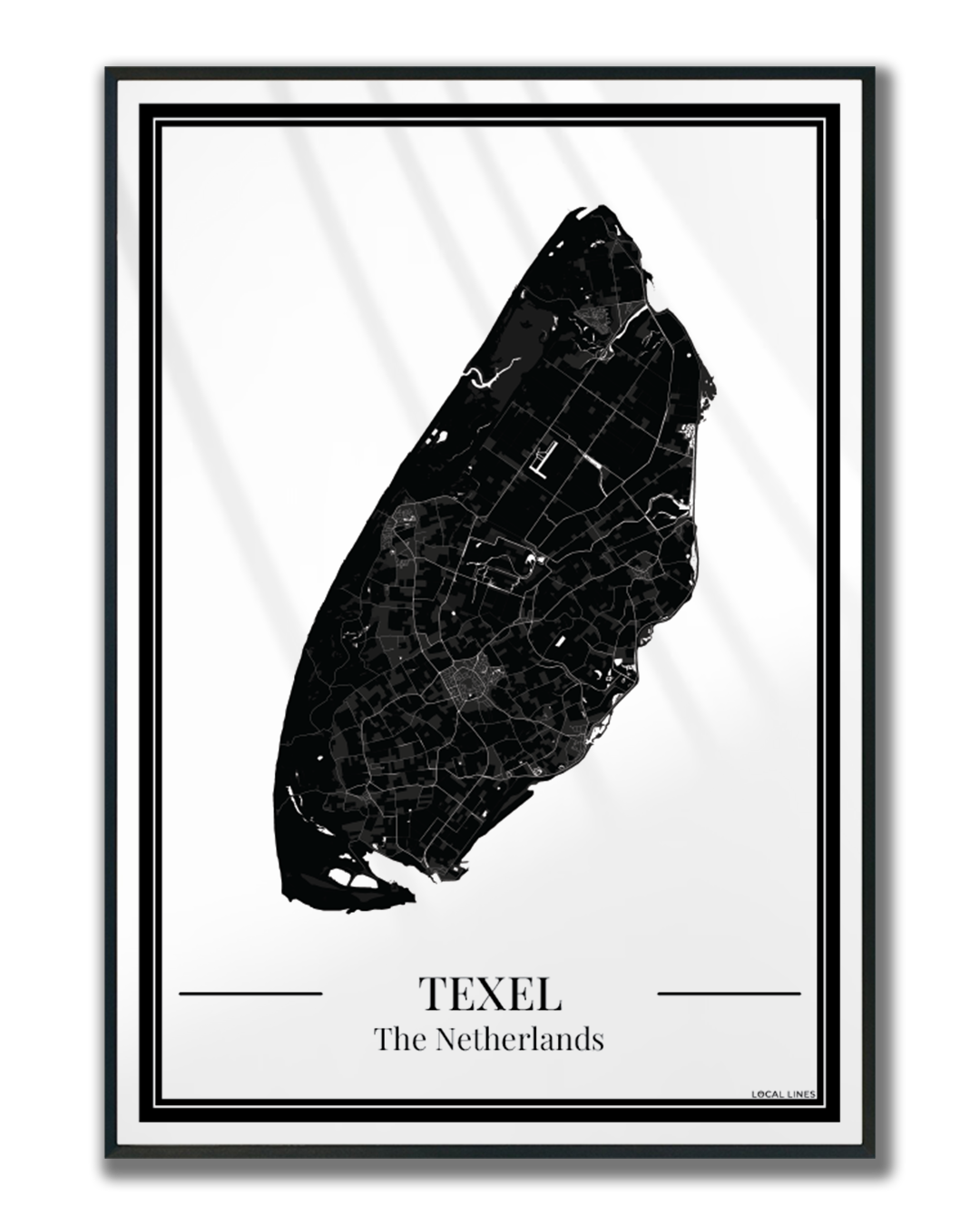 Texel als wanddecoratie: deze eilandkaart poster toont alle straten en wijken en brengt het eiland stijlvol in huis. Perfect als cadeau of moderne toevoeging aan je interieur.
