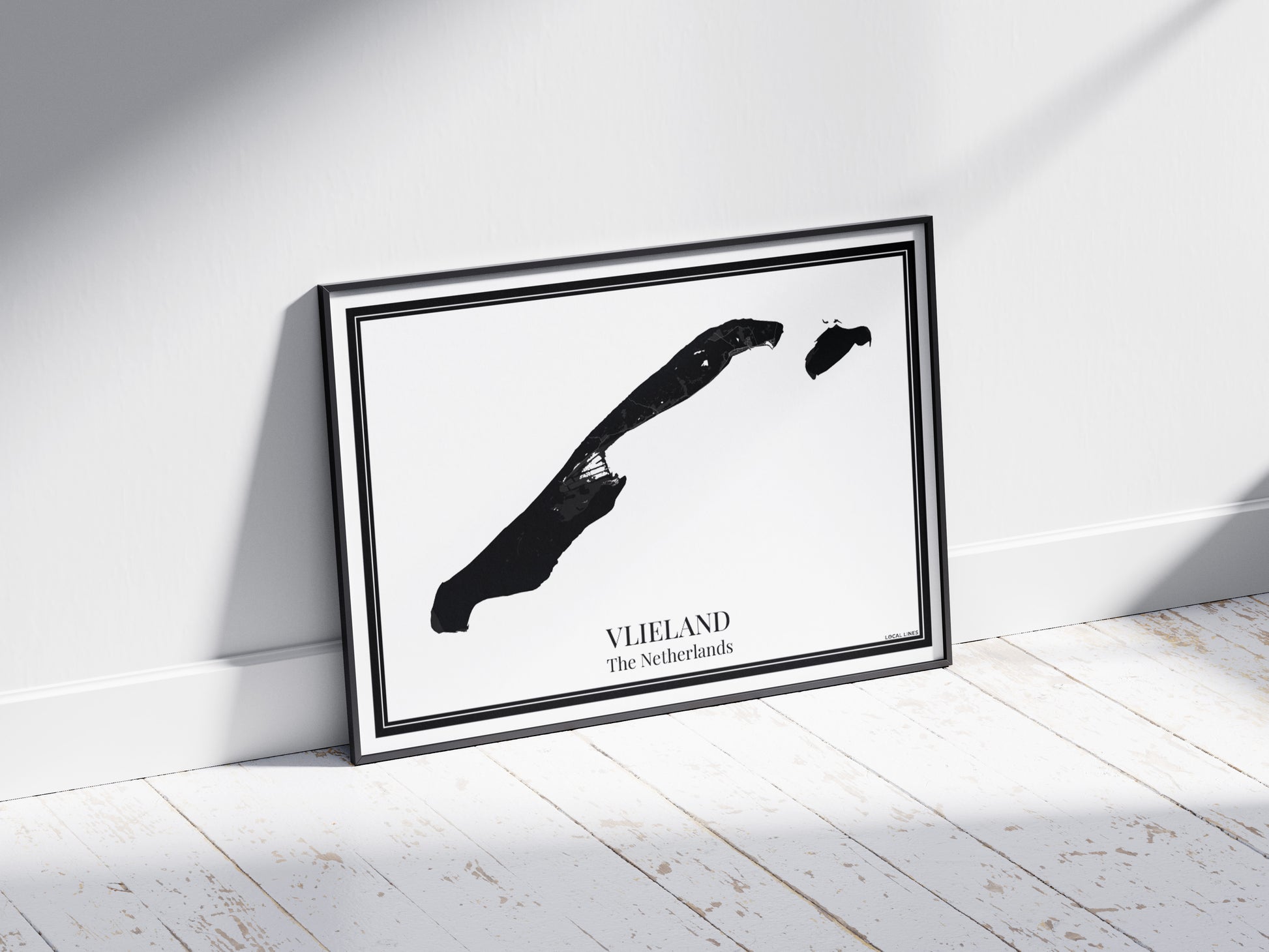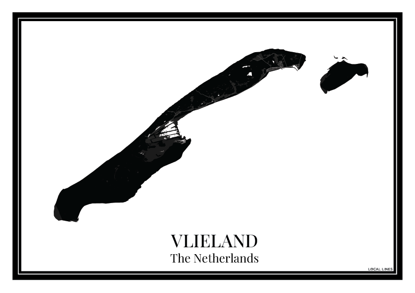 Vlieland als wanddecoratie: deze eilandkaart poster toont alle straten en wijken en brengt het eiland stijlvol in huis. Perfect als cadeau of moderne toevoeging aan je interieur.