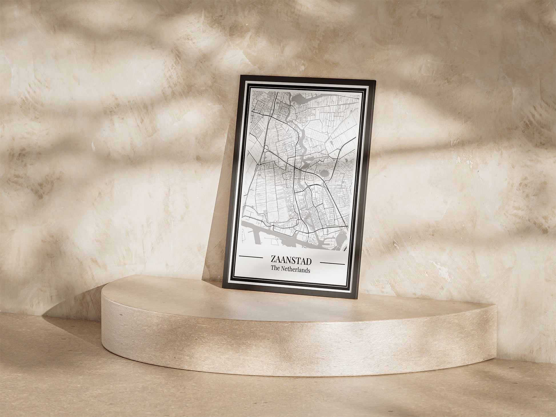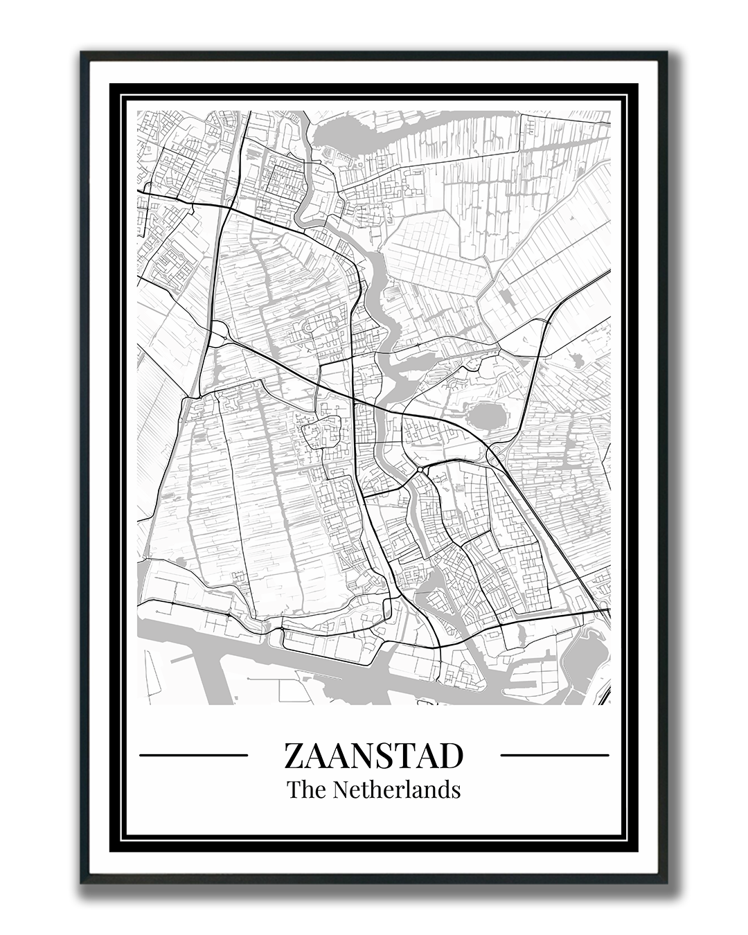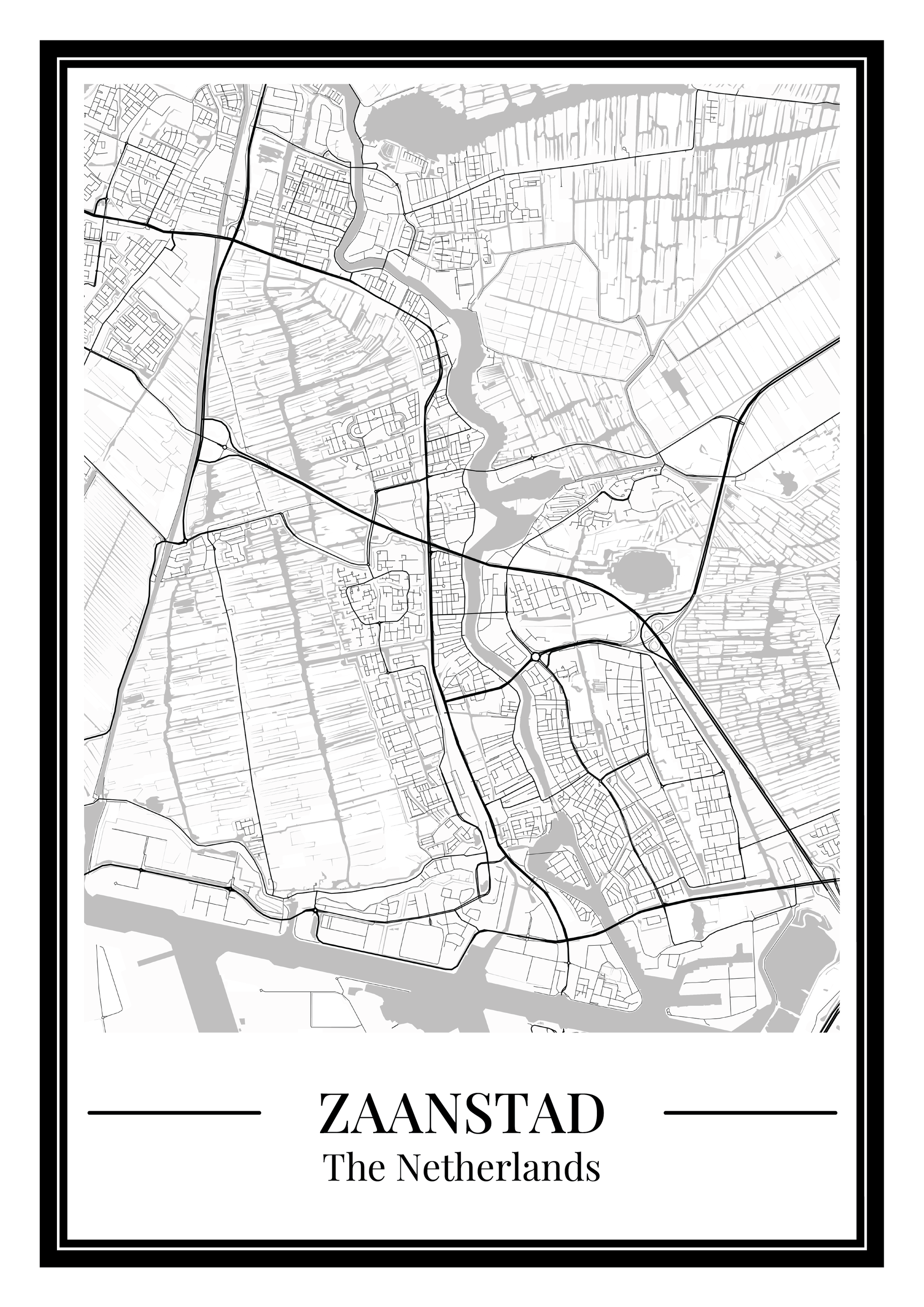 Zaanstad als wanddecoratie: deze stadskaart poster toont alle straten en wijken en brengt de stad stijlvol in huis. Perfect als cadeau of moderne toevoeging aan je interieur.